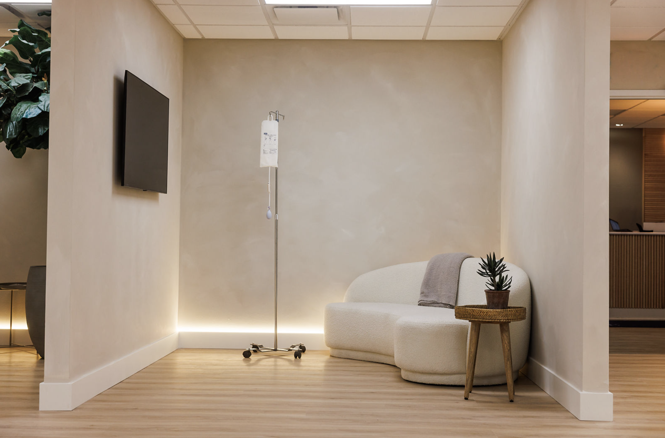 Members enjoy the relaxation of a full entertainment suite in a private treatment bay while receiving hydration services tailored to their needs and goals.